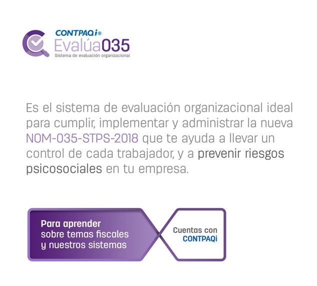 Aplicación que te ayuda al cumplimiento y administración de la NOM035. CONTPAQi® Evalúa035, es el sistema de evaluación organizacional ideal para cumplir, implementar y administrar la nueva NOM-035-STPS-2018 que te ayuda a llevar un control de cada trabajador, y a prevenir riesgos psicosociales en tu empresa